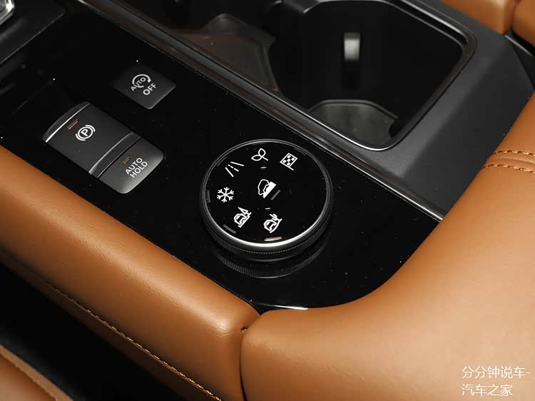 中央扶手区域十分宽大,这里分布着电子挡把、杯架、手机无线充电区域,如果是四驱车型,这里还提供了全地形模式的切换旋钮。