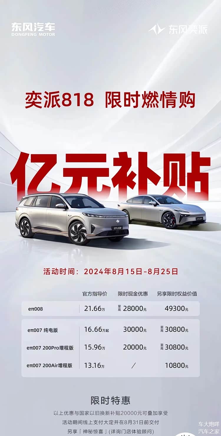 日前,笔者从东风奕派官方获悉,东风奕派eπ008以及东风奕派eπ007现已推出新的限时购车优惠,并且能与国家以旧换新补贴20000元叠加享受,活动时间为2024年8月15日-8月25日。
