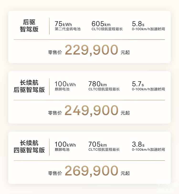 结合三款车型的价格、配置、续航等方面来看,100KWh长续航后驱智驾版比入门车型高了2万元,但电池容量增加了25度,可以作为首选,此次是考虑入门的75KWh后驱智驾版。