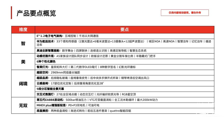 内饰也有琥珀焰红、白色、黑色多种风格,环抱式的座舱内配备由11.9英寸虚拟座舱显示屏+14.5英寸MMI触控屏组成的曲面双联屏,再配合10.9英寸副驾娱乐屏,以及13.1英寸W-HUD抬头显示,营造出满满的科技氛围,车机系统采用全新UI/UX交互设计,还支持智能语音助手、高德导航以及智慧生态等。此外还将提供两种造型方向盘、电子滑块式换挡机构、40W手机无线充电等。