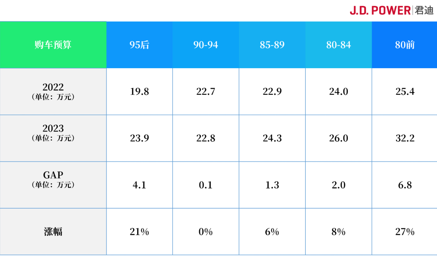 J.D.POWER的2023中国新车购买意向研究(NVIS)报告,涨幅最大的年龄区间为80前,预算金额达到6.1万元,其次为95后,涨幅为4.1万元,达到23.9万元。