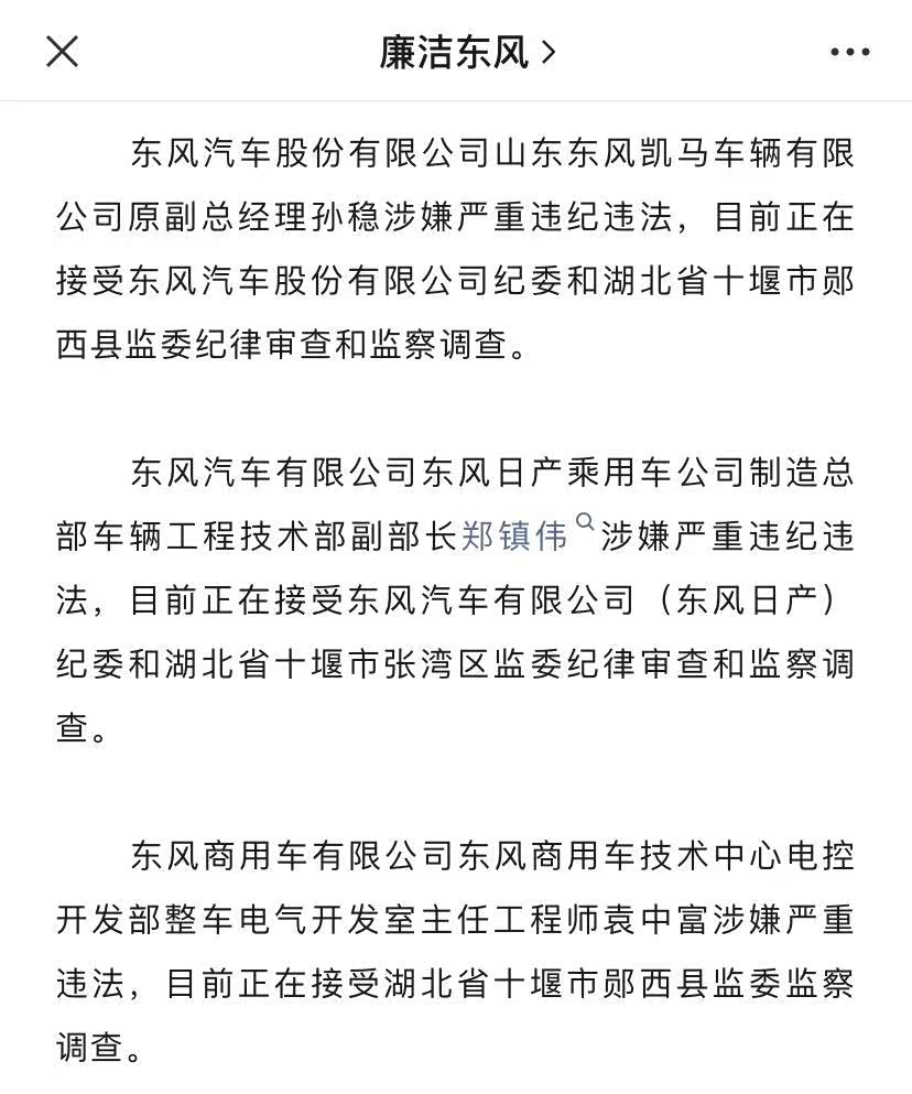 东风汽车集团有限公司官方微信公众号“廉洁东风”在10月20日发布消息,指出孙稳、郑镇伟、袁中富等3名高管涉嫌严重违纪违法。