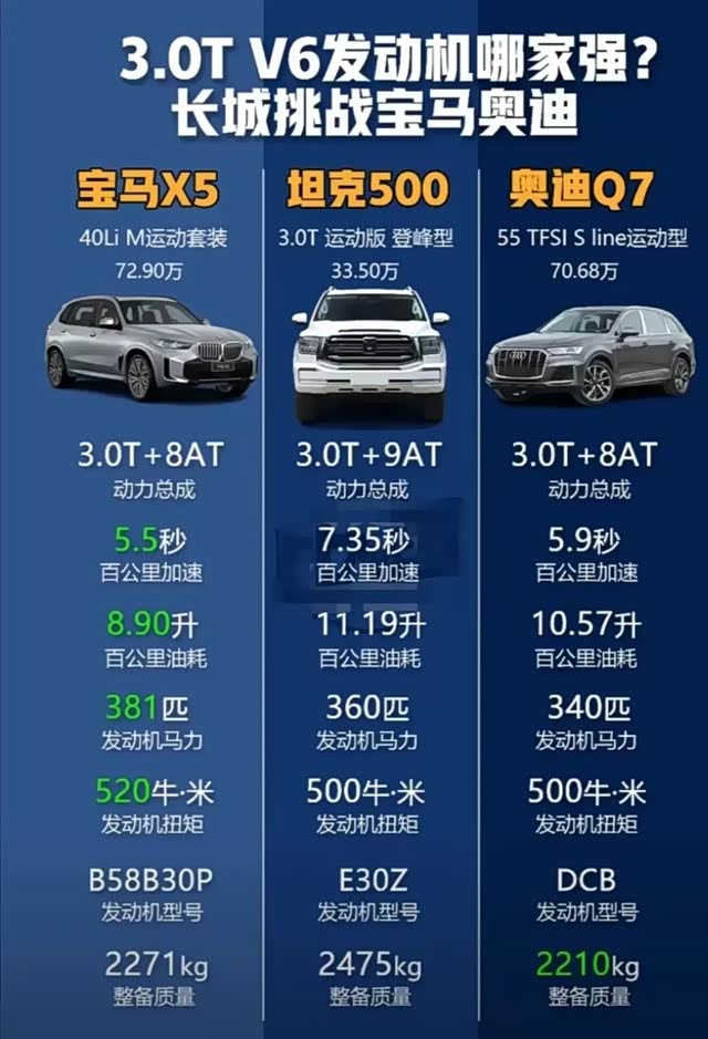 同样是3.0T排量发动机,宝马X5是8AT,坦克500是9AT,结果宝马发动机能爆发出381匹马力,520扭矩,而长城是360匹马力,500扭矩,来看还是宝马技术厉害,其实这也不奇怪,毕竟人家玩汽车玩了100多年,这就是为什么很多人都说宝马操控性好。虽然说宝马X5和奥迪Q7的百公里加速耗时都比坦克500短,但后者的质量多了200多千克,一定程度上拖累加速。整体来说坦克500性价比更高,毕竟只有另外两款产品一半的价钱,当然拿这三款车进行对比不太公平,宝马和奥迪这两款车是普通家用SUV,坦克500是真正的越野车,那么你会选择哪款呢?
