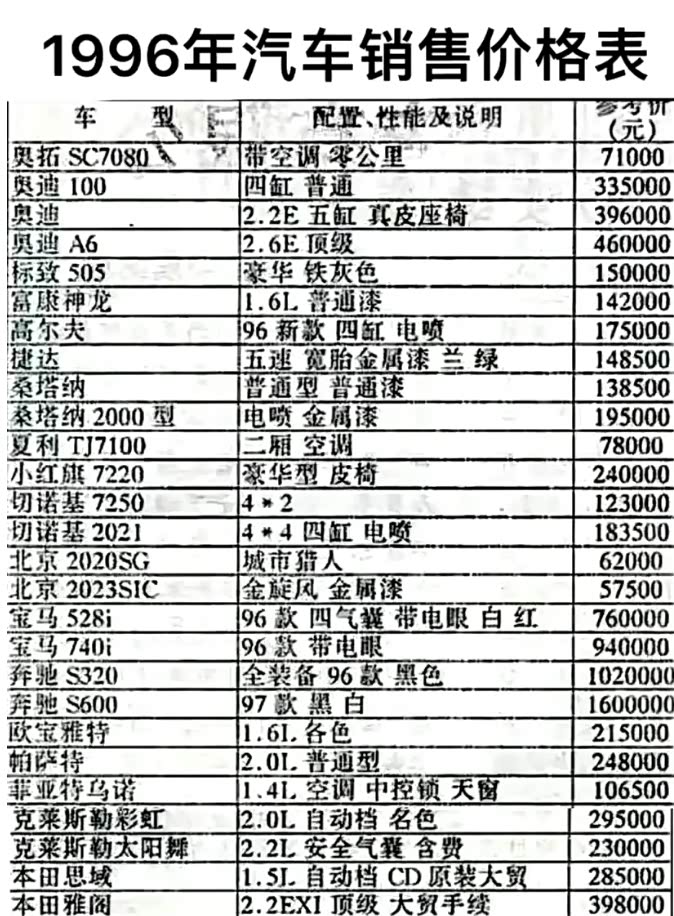 偶然找到了一张1996年的汽车销售价格表,真的是能吓死人。