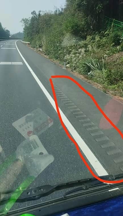 这东西叫隆生带,是一种道路安全设施,往往会设置在高速或者高架桥边上。肉眼看上去就是一条凸凹不平的白线,轮胎压上去就会发出一定的声音。