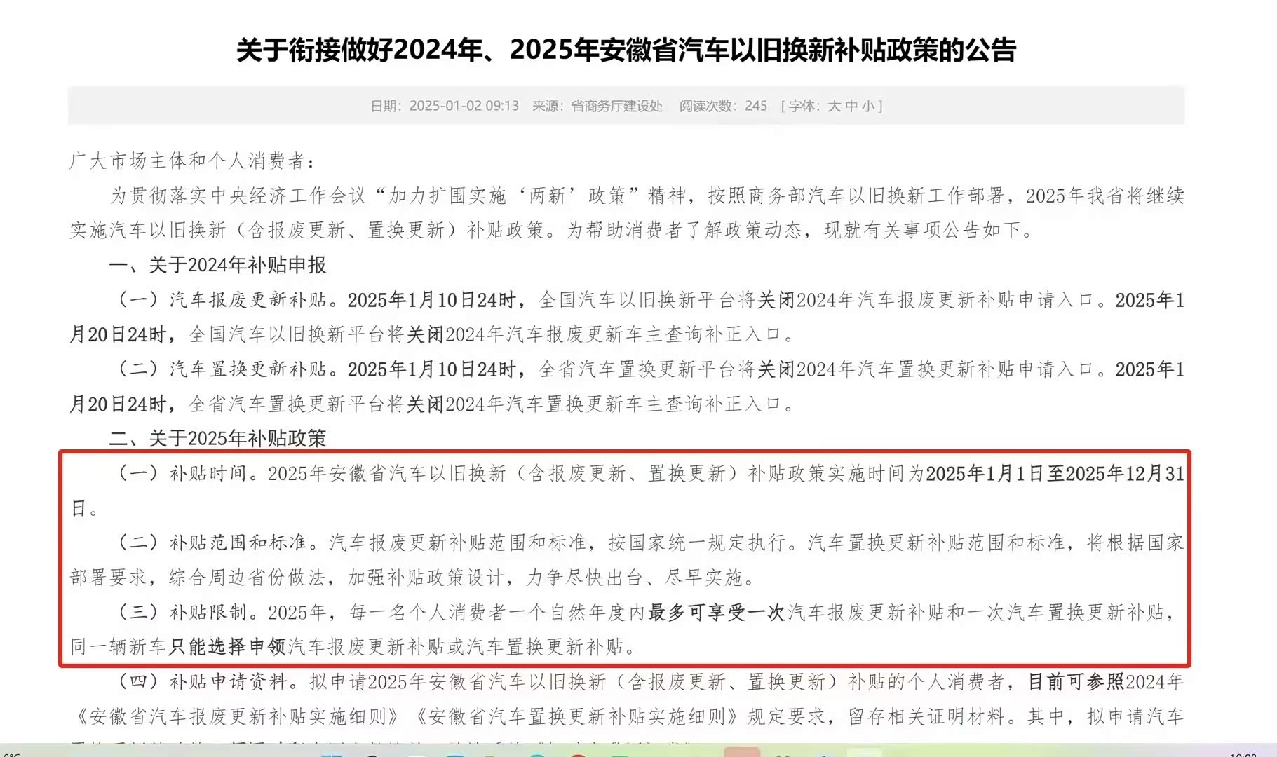 总结:关于2025年安徽省汽车“以旧换新”补贴政策公告主要传达意思,大概内容个人总结如下↓