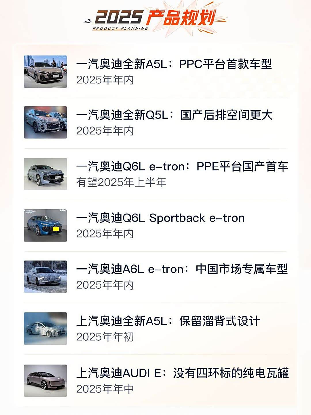 【2025年奥迪有6款新车,而且没有改款,全是换代!】 2025年 我估计奥迪要大爆发,6款新车,没有改款,都是全新的! A4换代改名A5,一汽是三厢版,上汽是掀背版!全新PPC平台! 全新Q5L是燃油车, Q6L e-tron 和 Q6L sportback e-tron是同平台的姊妹车,一个传统SUV,一个轿跑SUV 纯电的! 上汽奥迪AUDI E 针对中国市场与上汽集团合作推出的! 这些产品 都是豪华 品牌里 很能打的产品! 奔驰,宝马得想对策了!