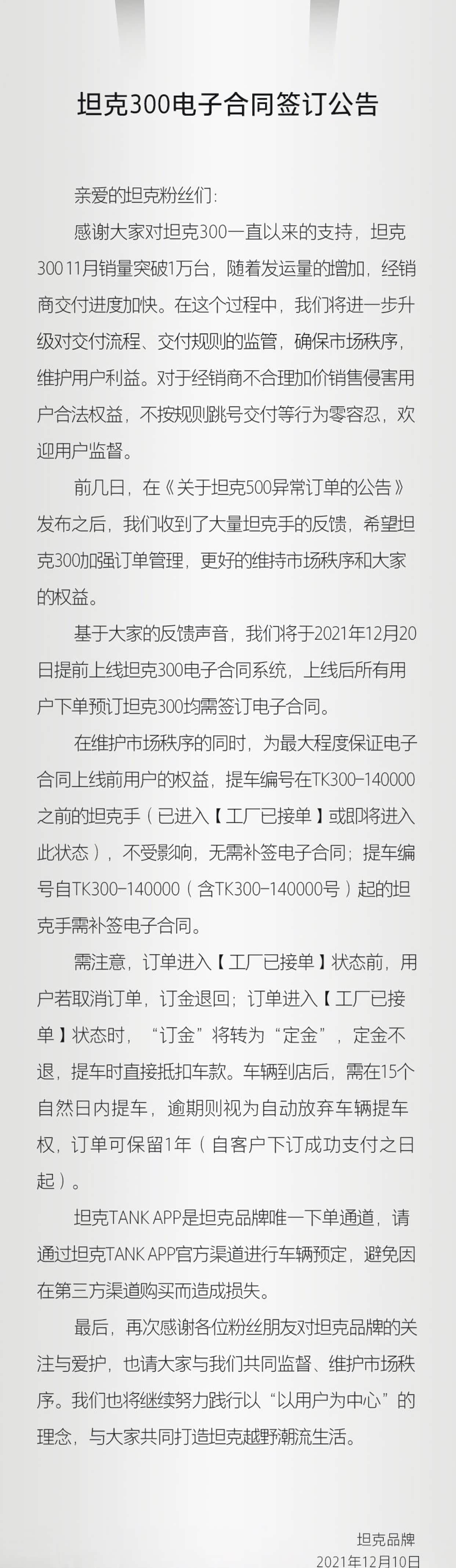 【12月20日上线电子合同系统 下单预定坦克300均需签电子合同】坦克品牌发布公告,将在2021年12月20日提前上线坦克300电子合同系统,上线后所有用户下单预定坦克300均需签订电子合同。维护市场秩序的同时,为最大程度保证电子合同上线前用户的权益,提车编号在TK300-140000之前的坦克手(已进入【工厂已接单】或即将进入此状态),不受影响,无需补签电子合同;提车编号自TK300-140000(含TK300-140000号)起的坦克手需补签电子合同。需注意,订单进入【工厂已接单】状态前,用户若取消订单,订金退回;订单进入【工厂已接单】状态时,“订金”将转为“定金”,定金不退,提车时直接抵扣车款。车辆到店后,需在15个自然日内提车,逾期则视为自动放弃车辆提车权,订单可保留1年(自客户下订成功支付之日起)。坦克TANK APP是坦克品牌唯一下单通道,避免因在第三方渠道购买而造成损失。